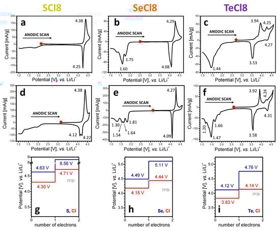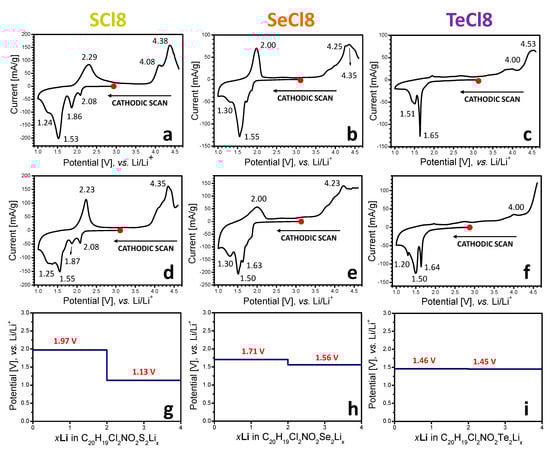 As a measure of the comparison between the calculated and experimental data, Figure 3g–i gives the calculated standard potentials of the reduction stages of the three compounds. In general, all reduction potentials fall in the potential range between 1 and 2 V vs. Li/Li+, which is in perfect agreement with the experimental observations (Figure 3a–f). If the first two peaks in the CV curve in the cathodic scan of SCl8 and SeCl8 correspond to the consecutive reduction by two electrons (or two Li+, Figure 3a,b), the computed values are exactly their average (Figure 3g,h). The difference between the potentials corresponding to the reduction with two and four Li atoms diminishes in the order S > Se > Te, culminating in almost-indistinguishable two-stage potentials at TeCl (Figure 3i). This is the experimental order that we observed by the first cathodic scan of NI derivatives, too (Figure 3c,f).
