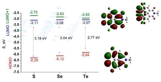 Energy (in eV) of the highest occupied (HOMO) and the two lowest unoccupied (LUMO and LUMO+1) molecular orbitals of the modeled S-, Se-, and Te-containing NIs.