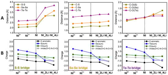 Calculated averaged lengths (in Å) of key bonds (A) and charge distribution among the different molecular fragments (B) of oxidized (2+, 1+), neutral, and reduced (2Li, 4Li) SCl, SeCl, and TeCl. The numerical values can be found in Tables S2 and S3.