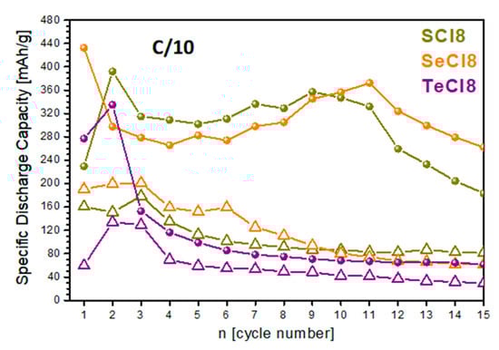 Cycling stability of SCl8, SeCl8, and TeCl8 used as electrodes in lithium half-cells starting with a discharge mode, (—△—) pristine compounds, (—●—) composites with rGO.