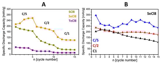 Rate capability (A) and cycling stability (B) of the composites SCl8/rGO, SeCl8/rGO, and TeCl8/rGO used as electrodes in lithium half-cells starting with a discharge mode at rates C/5, C/2, and 1C.