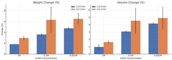 4, CCB EPDM exhibited an average weight increase of 1.82% and volume increase of 0.97%, while RCB EPDM showed increases of 2.95% and 1.63%, respectively. The difference widened at 0.1 M, at which concentration CCB EPDM’s changes reached 3.61% for weight and 3.06% for volume, while RCB EPDM’s changes rose to 6.30% and 4.53%, respectively. At the lowest concentration (0.001 M), RCB EPDM again swelled more, with a 6.50% weight increase and a 4.90% volume increase, compared to 4.75% and 4.15% for CCB EPDM.