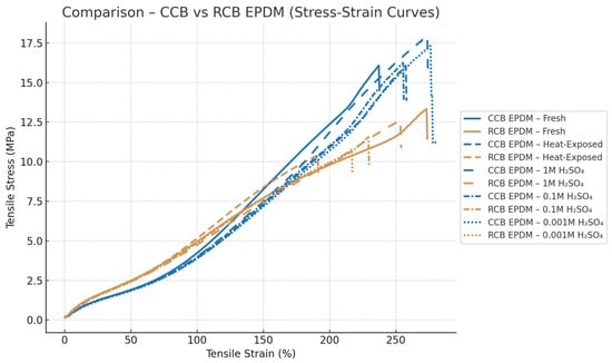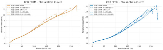 The tensile behavior of the two ECO EPDM materials—CCB EPDM and RCB EPDM—was evaluated under fresh, heat-exposed, and acid-aged conditions. Representative stress–strain curves were averaged from multiple replicates per condition, and strain was plotted as the percentage elongation (