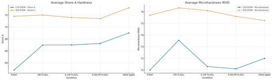 In the fresh state, RCB EPDM showed an average Shore A hardness of approximately 72, while that of CCB EPDM was measured to be around 63. A similar trend was observed in IRHD microhardness, with RCB EPDM’s reaching 76 and CCB EPDM’s reaching around 71. After 1 M H2SO4 exposure, both materials softened slightly.