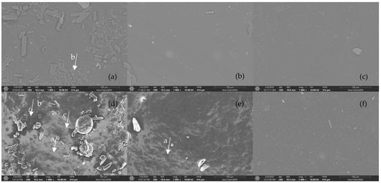 Figure 5d, representing the fresh RCB EPDM, clear evidence of surface porosity (marked as ‘a’) can be observed. These porous regions manifest as darker areas featuring distinct cavities and voids. Such porosity could potentially impact the material’s performance in harsh environments, influencing aspects like fluid absorption and mechanical durability.