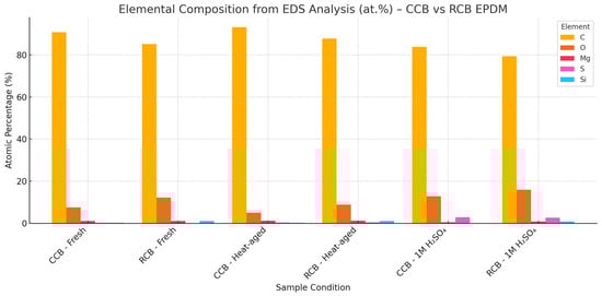 Figure 5c,f) reveal rough, irregular surfaces with microvoids and matrix erosion. For CCB EPDM, carbon dropped sharply to 83.8 at.%, while oxygen and sulfur rose to 12.8 and 2.9 at.%, respectively. RCB EPDM also showed carbon loss (79.4 at.%), with oxygen increasing to 16.0 at.% and sulfur to 2.6 at.%. Notably, the RCB EPDM surface retained detectable Zn and Si, but the magnesium content was slightly reduced in both formulations. These results suggest that both materials underwent oxidative and acid-induced degradation, but RCB EPDM showed greater carbon loss and oxygen uptake, indicating more severe chemical breakdown.