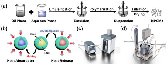 Preparation process flow diagram and equipment diagrams: (a) suspension polymerization process flow diagram, (b) MPCM working schematic, (c) ultrasonic emulsification device, (d) stirring polymerization device.