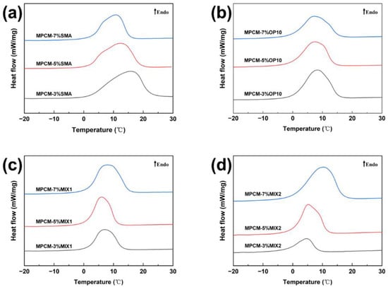 The thermal properties of MPCMs and the dosage of the compound emulsifier showed a positive correlation trend. At low emulsifier concentrations, only a portion of the latex particle surface is covered by emulsifier molecules. Under such conditions, latex particles tend to aggregate or adhere, leading to poor dispersion of the MPCMs. Additionally, the shell material cannot effectively form a core–shell structure, resulting in low phase-change enthalpy of MPCMs. As the emulsifier concentration increases, the oil–water interfacial tension is reduced, and emulsifier molecules rapidly diffuse to newly formed interfaces. This rapid coverage by a monomolecular layer of surfactant stabilizes the interface and prevents droplet recombination. A stronger stabilization tendency leads to better emulsifier performance, generating more stable emulsion systems with smaller particle sizes and better dispersion of microcapsules after polymerization. The phase-change enthalpy of MPCMs decreased with higher SMA and OP10 doping. Compared to larger MPCMs of the same mass, smaller MPCMs contain less core material, leading to lower phase-change enthalpy. Additionally, the suspension polymerization method used in this study requires the emulsifier dosage to remain below the critical micelle concentration (CMC). As a result, solid particles are formed, leading to a reduced encapsulation rate of the microcapsules [11,17].