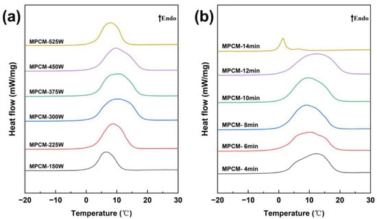 DSC curves of MPCMs prepared with different ultrasonic dispersion parameters: (a) ultrasound power, (b) ultrasound time.