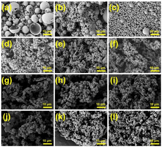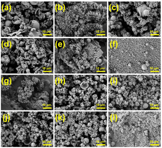 SEM images of MPCMs prepared with different ultrasonic dispersion parameters: (a) 150 W, (b) 225 W, (c) 300 W, (d) 375 W, (e) 450 W, (f) 525 W, (g) 4 min, (h) 6 min, (i) 8 min, (j) 10 min, (k) 450 W, (l) 12 min.