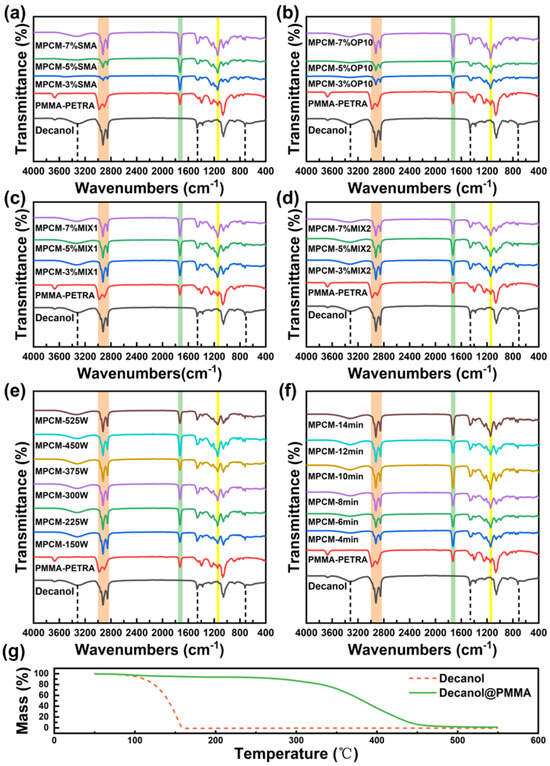 (a–f) Infrared spectra of MPCMs prepared using different ultrasonic dispersion emulsification processes, (g) thermogravimetric curves of 1-decanol@PMMA and pure 1-decanol.