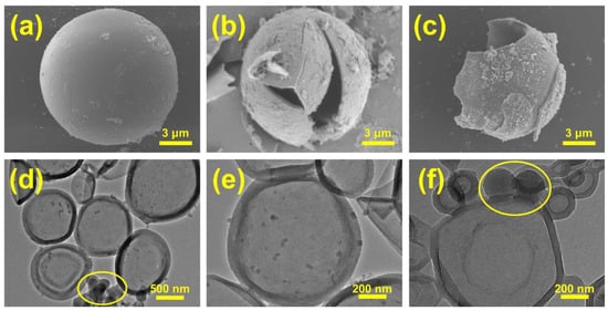 Figure 7a–c show SEM images of individual microcapsules. A clear core–shell structure can be observed from the broken shells, where a polymer shell composed of PMMA encapsulates the PCM. Figure 7d–f present TEM images of 1-decanol@PMMA, further confirming the core–shell structure and good dispersibility [46]; 1-decanol@PMMA observed by TEM appeared less spherical than in SEM images, due to deformation under the high-energy electron beam at greater magnifications. In Figure 7d,f (marked circles), the small-sized microcapsules exhibit a darker contrast than the larger ones, indicating less core material was encapsulated inside. Figure 8f shows that the shell material of small-sized microcapsules occupies a relatively large volume fraction in the MPCMs. Additionally, the high concentration of SMA and OP10 used as emulsifiers leads to the formation of numerous smaller solid particles, which subsequently reduces the overall phase-change enthalpy of MPCMs shown in Figure 2.