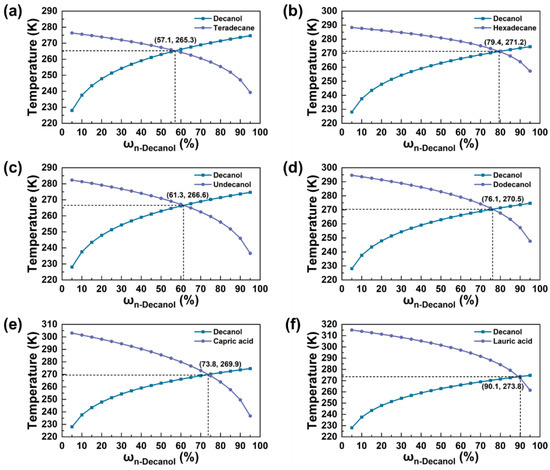 Phase diagram of binary eutectic PCMs: (a) 1-decanol/1-tetradecane, (b) 1-decanol/1-hexadecane, (c) 1-decanol/1-undecanol, (d) 1-decanol/1-dodecanol, (e) 1-decanol/capric acid, (f) 1-decanol/lauric acid.