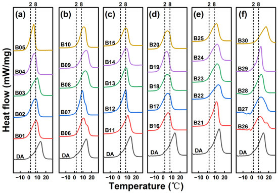 In this study, 1-tetradecane, 1-hexadecane, 1-undecanol, 1-dodecanol, capric acid, and lauric acid are separately combined with 1-decanol to form binary eutectics. The eutectic points of binary eutectic cores were determined by plotting binary phase diagrams. The thermal properties of the eutectic points are shown in Table 4. As shown in Figure 8, these eutectic points after compounding are all below 0 °C. Therefore, the peak temperatures of the binary eutectic cores lie within the temperature range of 2–8 °C. This facilitates heat absorption by the MPCMs within the 2–8 °C interval, thus enhancing the cold-storage performance of the materials.