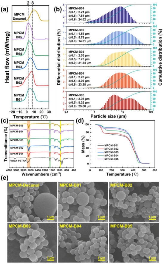 Properties of binary-core MPCMs: (a) DSC curves, (b) particle size distribution, (c) infrared spectrum, (d) thermogravimetric curves, (e) SEM images.