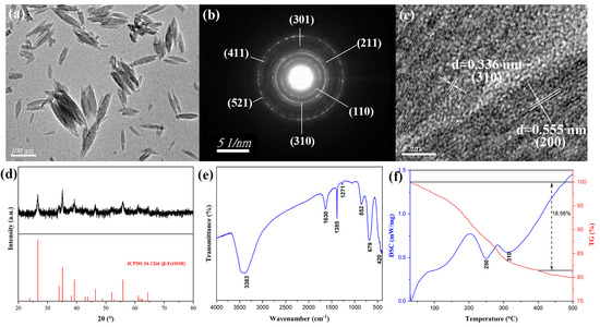 TEM micrograph (a), SAED image (b), HRTEM image (c), XRD pattern (d), FTIR spectrum (e), and TG-DSC analysis (f) of β-FeOOH NRs fabricated at the hydrothermal temperature of 100 °C for 2 h using ferric chloride of 0.15 M in 50% alcohol-containing aqueous solution.