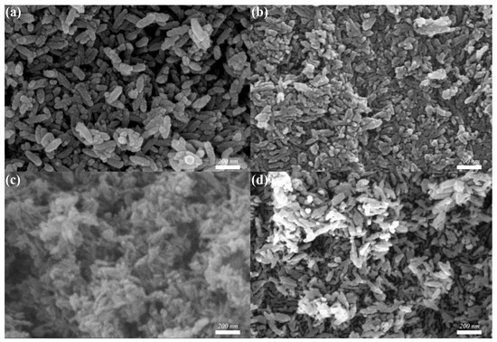 So, to prepare nanomaterials with better morphology and performance, the effect of volume ratio of ethanol was explored. The SEM morphologies of β-FeOOH nanomaterials fabricated at the hydrothermal temperature of 120 °C for 2 h using ferric chloride of 0.1 M in various volume ratios of ethanol and aqueous solution were presented in Figure 2.