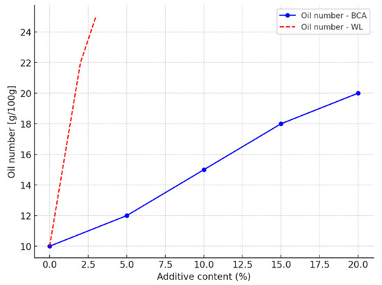 The observation of changes in oil number as a function of BCA content confirms that the higher the specific surface area and adsorption capacity, the higher the water requirement, which is crucial when designing the optimum proportions in cementitious mixtures [30].