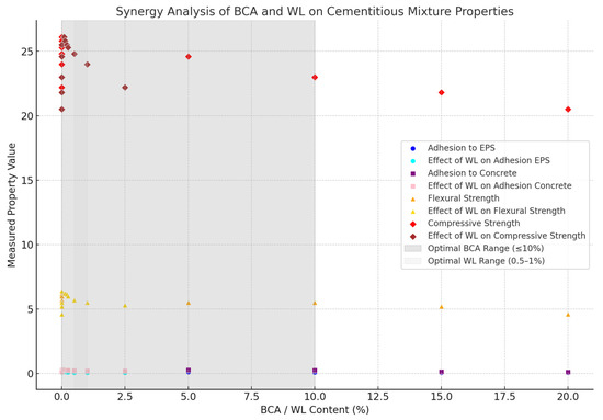 - WL effects: WL positively affects adhesion to EPS and concrete. It improves adhesion more effectively than BCA. It negatively affects flexural and compressive strength when it exceeds 1%, probably due to over-saturation [42].