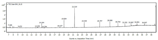 The analysis of the samples was conducted using an Agilent GC-MS system (GC 7890B/MS 5977B), produced Agilent Technologies Inc., CA, USA, equipped with a DB-5MS column (30 m × 0.25 mm × 0.25 μm; AGILENT). The analytes were adsorbed using a FIB-C-WR-95/10-P1 Carbon WR/PDMS fiber (PALSystem) with a fiber thickness of 95 µm and a fiber length of 10 mm, installed in the arm of an MPS Robotic multi-functional autosampler (Gerstel), producers GERSTEL GmbH & Co. KG, Germany. In the analysis, 2.5 ppm of Cariophilene was added as an internal standard. The fiber was preconditioned by heating at 270 °C for 30 min, and for 1 min before and after each analysis under the same conditions. Before extraction, the sample was conditioned at 60 °C for 10 min, followed by volatile compound extraction at the same temperature for 10 min. Desorption of the analytes was carried out in the injector for 5 min [23,24].