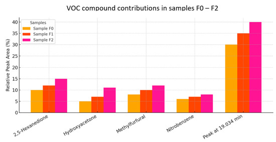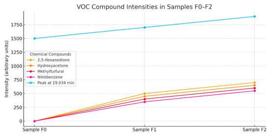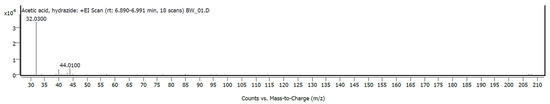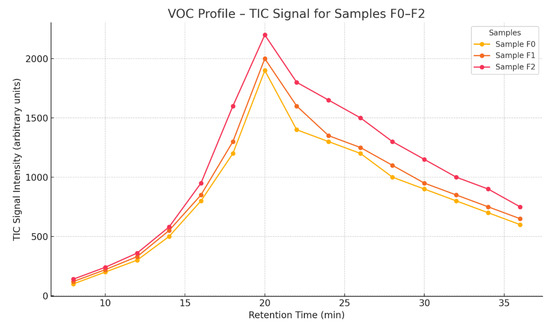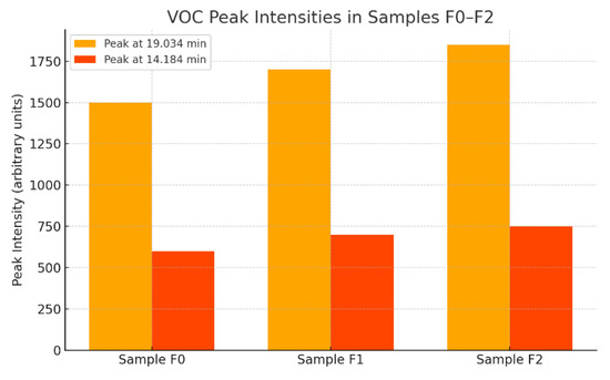The instrument operating conditions were as follows: an injector temperature of 250 °C; a split ratio of 10:1; and a helium flow rate of 1.0 mL·min−1. The temperature program was as follows: a 40 °C hold time for 2 min, then an increase to 150 °C at a rate of 5 °C·min−1, followed by an increase to 250 °C at a rate of 10 °C·min−1. The quadrupole, ion source, and transfer line temperatures were set at 150 °C, 230 °C, and 250 °C, respectively. Identification of volatile organic compounds was performed using the NIST17 [25] mass spectral library.