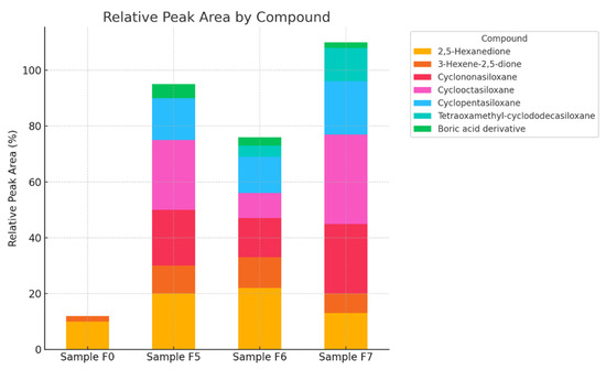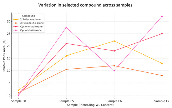 VOC emissions: One of the most critical limitations of WL is its significant contribution to the emission of volatile organic compounds (VOCs). As observed through GC-MS analysis, increasing the WL content (especially >0.5%) markedly elevated the presence of siloxanes and diketones, raising concerns for indoor air quality and regulatory compliance [51].