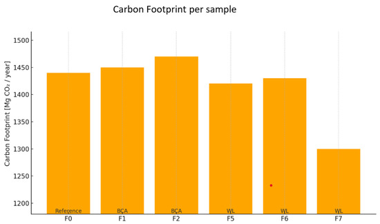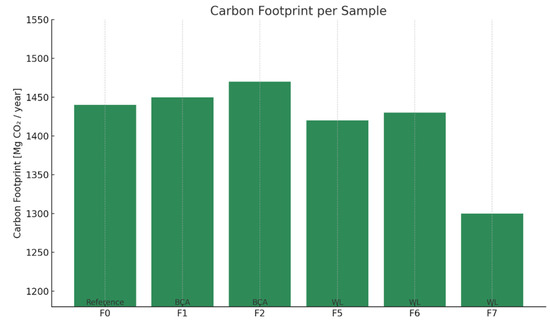The analysis aimed to determine the annual carbon footprint (CO2 emissions) for a reference sample and recipe variants containing waste raw materials (biochar, ash, sodium lignosulphonate). The calculations were performed on a ‘cradle-to-gate’ basis, i.e., they included the emissions associated with the production and delivery of raw materials to the plant.
