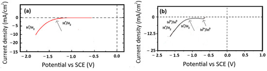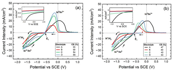 Therefore, to better explain what happens in Figure 1, when indium sulfate is only in the electrolyte, two voltammograms were reported in Figure 2, considering two different metal cathodes (titanium and indium) at 25 °C and a pH of 2.3. An acidic solution without indium sulfate has been used on the titanium cathode, while on the indium cathode an acidic solution with indium sulfate has been utilized, as shown in Figure 2a,b. As expected, in the first case, it is possible to highlight that HER starts at about −1.35 V, being the unique reduction reaction. In the second case, two reactions took place, namely the indium reduction at −0.64 V with a peak at around −0.7 V, while HER starts at around −1.0 V. The comparison between Figure 2a,b could represent what happens when an indium layer is present on a titanium cathodic surface, which can act as an indium cathode. Finally, CE was calculated for all cases based on cyclic voltammetry analysis and reported in Figure 1. The results indicate that when a single additive is used, CE decreases, whereas it slightly increases when both boric acid and sodium sulfate are used, particularly at low scan rates.