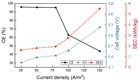 Current density effect from 25 to 150 A/m2 on CE, CV and SEC at 40 °C and pH 2.3 using a solution containing 70 g/L In3+.