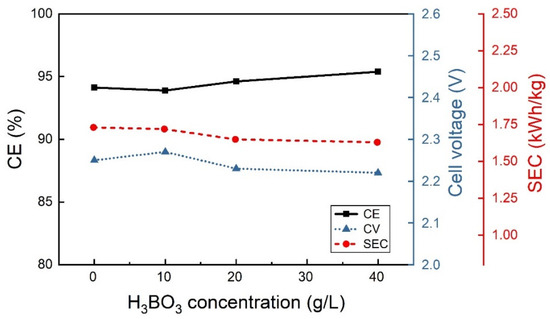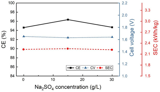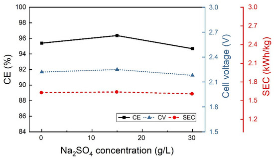 The additives, sodium sulfate and boric acid were studied separately at the lower CD of 25 A/m2, 40 °C and pH 2.3. The boric acid concentration seems to have very little influence on output results (Figure 4), although the best results in terms of CE and SEC were obtained at 40 g/L of H3BO3 concentration. Under the same operating conditions, the sodium sulfate concentration also seems not to have a notable effect on CE and SEC, as shown in Figure 5. Therefore, the combined effect of both components was also studied at the same operative conditions of pH and temperature, while 40 g/L boric acid and different Na2SO4 concentrations were used (Figure 6). Accordingly, with low CD values, the additives do not seem to have significant effects.