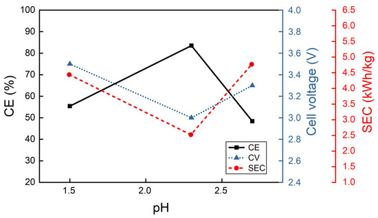 As can be observed from Figure 7, the current efficiency reaches its maximum at pH equal to 2.3, also confirming the results obtained in previous work using different cathodes [54]. At lower pH values, in particular, the solution is acidic favoring, at 100 A/m2, the hydrogen discharge reaction rather than the indium reduction. At higher pH values, the formation of insoluble indium hydroxides becomes more favored and therefore, in this case a decrease in CE also occurs.