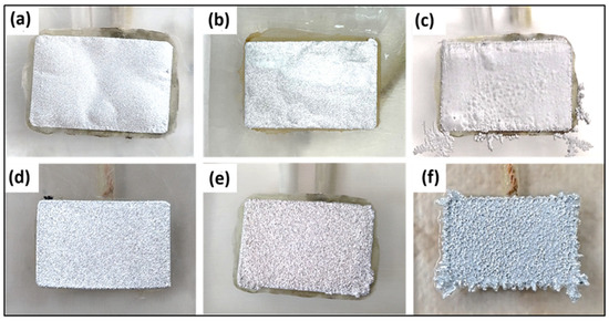 Macroscopic aspect of the indium deposits on the Ti surface, comparing samples without (a–c) and with (d–f) etching at different current densities: (a–d) 100 A/m2, (b–e) 150 A/m2 and (c–f) 200 A/m2.