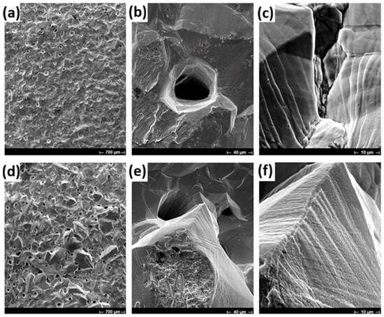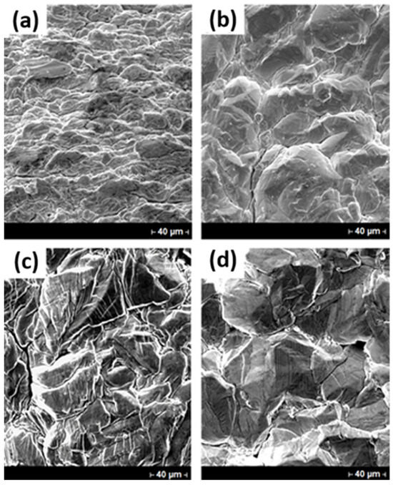 In the case of the boric acid addition to the electrolytic solution (Figure 10a–c), a similar morphology is obtained at low and high CDs. In particular, the presence of boric acid enhances the microstructure by producing highly defined surface features.