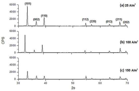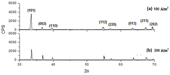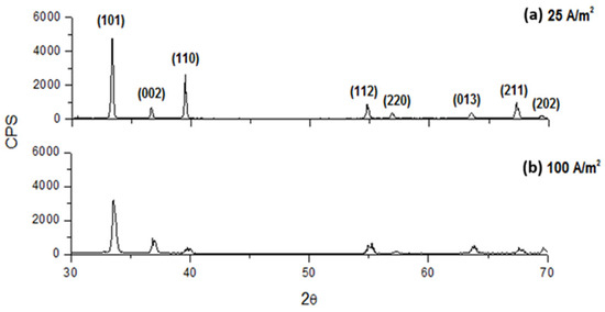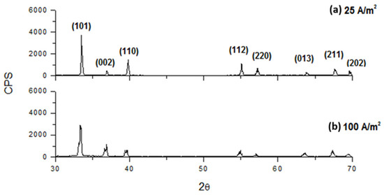 The crystallographic characteristics of the deposits at different CDs showed slight changes varying in the electrolyte composition. As the CD increased, the crystallinity generally decreased. Indeed, as it results from Figure 13, Figure 14 and Figure 15 for an electrolyte containing only 70 g/L In3+ or 70 g/L In3+ and 30 g/L Na2SO4 or 70 g/L In3+ and 40 g/L H3BO3, the intensity of diffractograms decreases progressively as CD increases. Moreover, the diffractograms, obtained at the highest current densities, show a slight change in the succession of the peak heights, independently from all other operative conditions. In particular, this analysis shows that the main preferential orientation is (101) and it is also the most intense peak for each CD, while the relative intensities of the second and third peaks change, with peak (110) tending to be more intense than peak (002) at low current densities, while at higher current densities the situation is reversed. Lastly, the sequence of intensities of the last five peaks is almost always unchanged when the composition and current density change.