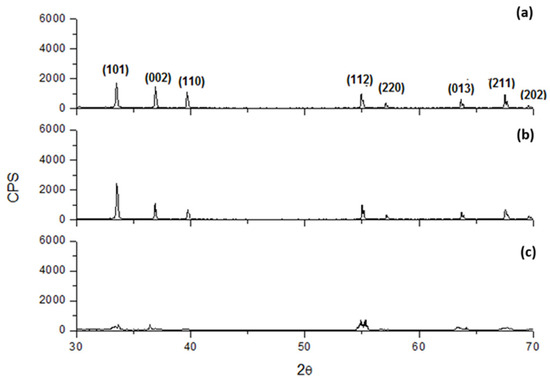 Diffractograms of indium electrowinning performed at different temperatures (a) 25 °C, (b) 40 °C and (c) 60 °C using the etched Ti cathode at 200 A/m2 and a sulfate electrolyte containing 70 g/L In3+ at pH 2.3 for 22 h.