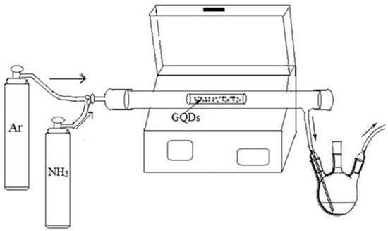 As mentioned earlier, GQDs were synthesized using Vulcan XC-72 carbon black and concentrated nitric acid (HNO3) oxidized by high temperature heating [16]. The specific experimental setup is shown in Figure 1. NGQDs were prepared using a homemade device in our laboratory. The specific operation is as follows: put the appropriate amount of GQDs into the quartz boat evenly dispersed, and then place the quartz boat in the quartz tube of the tube furnace. After closing the lid of the tube furnace, Ar and NH3 (about 99.99%) were passed into it at a rate of about 60 mL/min. It was then programmed to increase the temperature at a rate of 10 °C/min and to maintain a constant temperature for 1 h at a certain temperature. At the end of the process, the temperature was reduced at a rate of 10 °C/min until it reached room temperature. Finally, the NGQD samples were obtained as NGQDs-250, NGQDs-300, and NGQDs-350, where the numbers represent the heating temperature.