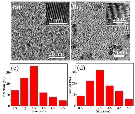 TEM images of the (a) GQDs and (b) NGQDs-300 (inset: HR-TEM images). The diameter distributions of (c) GQDs and (d) NGQDs-300.