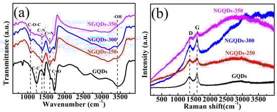 Infrared spectroscopy allows us to know the chemical structure of the functional groups of the sample, which allows us to determine the type and structure of the compound, and the FTIR spectra of all the prepared samples are shown in Figure 3a. From this figure, the functional groups on the surface of GQD and NGQD samples can be analyzed and determined. The graphs show that all the samples show significant IR absorption peaks in the range of 3000~3500 cm−1, which is due to the stretching vibration of -OH [14,18]. The wave numbers at 1717, 1435 cm−1 are due to the telescoping vibration of C=O and COOH, respectively. The less intense absorption peaks at 1559 cm−1 and 1373 cm−1 are due to the stretching and bending of C=N and C-N, respectively, which indicates the presence of N in the NGQD samples, implying successful nitrogen doping of GQDs. The peak at 1220~1250 cm−1 is attributable to the C-OH, C-C telescoping vibration and bending vibration of -OH, and the peak at 1059 cm−1 is due to the stretching vibration of C-O-C bond [19,20,21,22]. It is obvious from the figure that the peak of vibration absorption for C=O is weakened after nitrogen doping in GQDs by the thermochemical method.