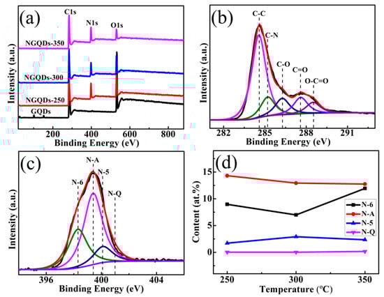 (a) The survey XPS spectra of GQD and NGQD samples. (b) C1s spectra of NGQDs-300. (c) N1s spectra of NGQDs-300. (d) Nitrogen-related components of the NGQD samples heated at different temperatures.