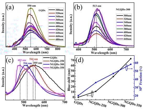 PL spectra of (a) GQDs and (b) NGQDs-300. (c) Normalized PL spectra of GQD and NGQD samples. (d) The dependence of the PL blue shift of the NGQD samples compared to GQDs on the value of sp2 fraction.