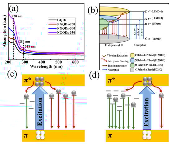 (a) UV-vis absorption spectra of the GQDs and NGQDs. (b) Schematic energy level diagram of NGQDs. Proposed PL emission mechanisms of (c) GQDs and (d) NGQDs.