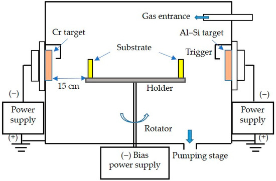 The coating treatment was carried out in this study using a CAD system. The schematic diagram of the coating equipment is shown in Figure 3. Based on the available CAD devices and the results of previous studies [32,33], the proper parameters for this coating experiment were set as follows. Two targets, Cr99.5wt.% and Al88wt.%-Si12wt.%, were used and placed in opposite positions of the vacuum furnace. The bias value was set to −100 V, the target current was set to 60 A, and the two gases containing argon (Ar) and nitrogen (N2) were fed into the vacuum furnace. Predictably, the CrN/AlSiN multilayered coatings could be obtained by varying the gas flow ratios of Ar/N2 to 2, 2.5, and 3, numbered S1, S2, and S3, respectively. In other words, the Ar/N2 ratio was increased by reducing the N2 flux at a fixed total gas flow rate. The main parameters of the deposition process for the experiment are listed in Table 2.