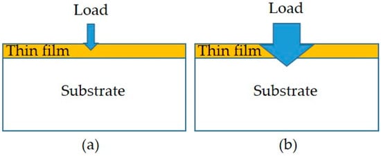 In this study, two types of hardness testing methods were conducted: the nanoindentation test without penetrating the film and the microhardness test with a penetrated film. Schematic diagrams of the two hardness tests are shown in Figure 4. The details are given below.