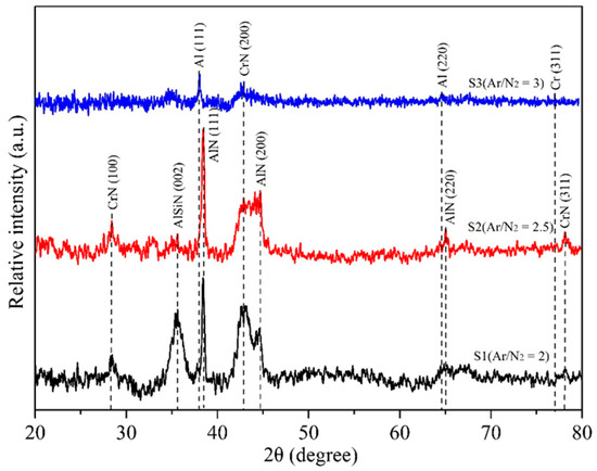 Figure 5 presents the XRD patterns of the film structures for the three coated specimens. The S1 specimen exhibited characteristic CrN peaks corresponding to the (111), (200), and (311) crystal planes at 2θ = 37.5°, 43.2°, and 76.2°, respectively, along with AlN characteristic peaks of (111), (200), and (220) crystal planes at 2θ = 38.4°, 44.6°, and 65.2°. These results indicate that the S1 film primarily consisted of CrN and AlN phases. Moreover, a small amount of AlN doped with Si, forming Al(Si)N, was also detected in the film. Such a result implied that a trace of the Al(Si)N phase was mixed in the AlN composition. For the case of S2, the CrN and AlN peaks in the XRD pattern were slightly weaker than those in S1 due to the lower nitrogen content (see Table 3). The XRD pattern of S3 further revealed that, with the lowest nitrogen content, the characteristic peaks of nitrides became less prominent, except for a small CrN(200) peak. Moreover, the trace amounts of Al and Cr peaks were observed in S3, while no Si peak was detected. This suggests that the Al and Cr elements remained in a crystalline state due to their higher concentrations in the film, whereas Si likely existed in an amorphous form. From the analytical results of the three coatings, it was found that nitrogen content significantly influenced the composition of the CrAlSiN coating structure. As the Ar/N2 ratio increased (i.e., the nitrogen content decreased), the CrN and AlN phase content reduced, leading to the deposition of some Cr and Al metal elements within the film. The formation of CrN and AlN phases during the PVD process is closely related to the availability of nitrogen in the plasma atmosphere. Nitrogen acts as a reactive gas that chemically bonds with sputtered metal atoms (Cr and Al) to form their respective nitrides. When nitrogen partial pressure is sufficient, it promotes the formation of stoichiometric nitride phases such as CrN and AlN, resulting in a well-defined crystalline structure. However, as the nitrogen content in the plasma decreases (i.e., with an increased Ar/N2 ratio), the reduced nitrogen availability limits the formation of these nitrides. As a result, a portion of the sputtered Cr and Al atoms remains unreacted and may be deposited in their metallic or sub-stoichiometric nitride forms. This incomplete nitridation can disrupt the crystallinity of the coating and lead to the presence of amorphous regions or less-defined phases, as reflected by the less pronounced XRD peaks in the low-nitrogen specimen (e.g., S3). This phenomenon has also been reported in some studies on PVD processes [38,39].
