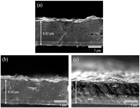 Cross-sectional observations of the coated specimens using FESEM were conducted to examine the effect of the Ar/N2 flow ratio on film thickness. As shown in Figure 6, film thickness decreased with an increasing Ar/N2 flow ratio, with average thickness values in the following order: S1 (8.42 µm) > S2 (8.16 µm) > S3 (7.63 µm). This indicates that a higher Ar/N2 flow ratio results in a slight reduction in film thickness. This is because argon (Ar) serves as an inert gas primarily responsible for sustaining plasma and generating sputtering ions through collisions in the PVD process. In contrast, nitrogen (N2) acts as a reactive gas that binds with sputtered metal atoms to form nitrides. When the Ar/N2 ratio increases (i.e., the nitrogen content decreases), the reduced availability of nitrogen limits nitride formation, which leads to a decrease in the overall deposition rate.