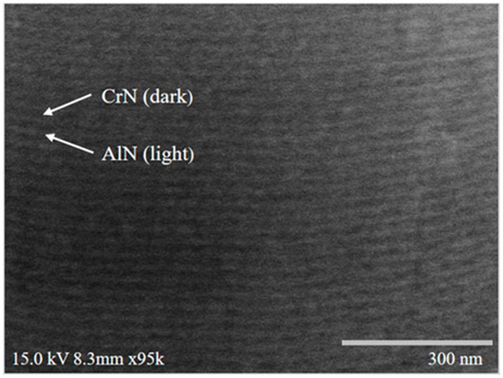 It is also observed that S3 appears to have smaller grain sizes compared to S1 and S2 (Figure 6c vs. Figure 6a,b), resulting in a thinner and more compact film under the same deposition time. This microstructural difference may also explain the less pronounced XRD peaks observed for S3 (Figure 5). The further high-magnification FESEM analysis of the S1 film cross-section revealed a well-defined multilayer morphology, as expected from the experimental design (Figure 7). This multilayered structure consists of alternating CrN and AlN layers, with CrN appearing as dark regions (~14 nm thick) and AlN as light regions (~17 nm thick). Figure 8 presents the SEM images of the surface morphology of the three coated specimens. The images reveal the presence of microdroplets on the CAD-coated surfaces, which is a well-known drawback of the CAD process that affects surface roughness [40,41]. Among the specimens, S1 (Figure 8a) exhibits the highest number of microdroplets, while S2 and S3 (Figure 8b,c) show a relatively lower droplet density.
