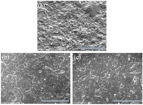 SEM surface morphologies of the coated specimens: (a) S1, (b) S2, and (c) S3.