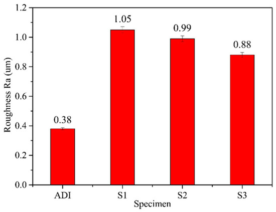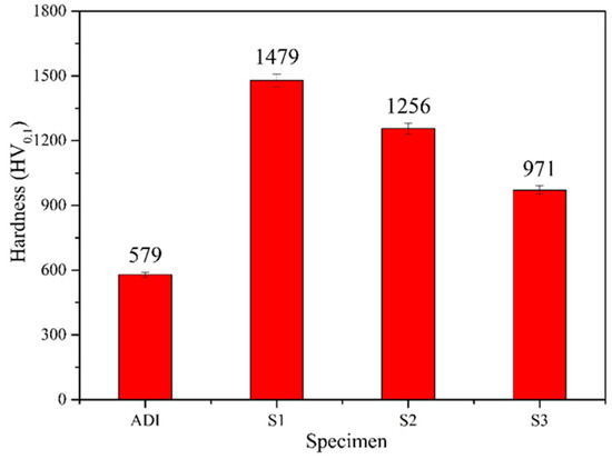 In this study, the Vickers hardness tester was used to analyze surface hardness. As shown in Figure 11, all three coated specimens exhibited a significant increase in surface hardness compared to the uncoated ADI substrate. The hardness values corresponded to the following order: S1 (1479 HV) > S2 (1256 HV) > S3 (971 HV) > ADI (579 HV), with S1 demonstrating the highest microhardness. The S1-coated specimen could increase the surface hardness value of the ADI substrate up to 2.5 times. Therefore, S1 provided the most significant enhancement for the surface hardness of ADI.