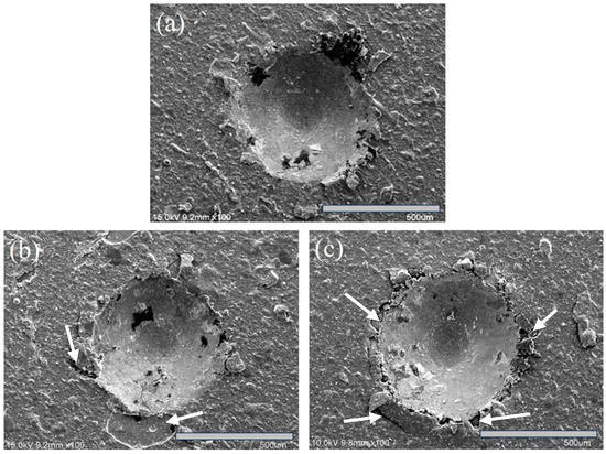 Fractured morphology of the coated specimens from the Rockwell-C adhesion test: (a) S1, (b) S2, and (c) S3. The arrows indicate cracked and flaked coatings.