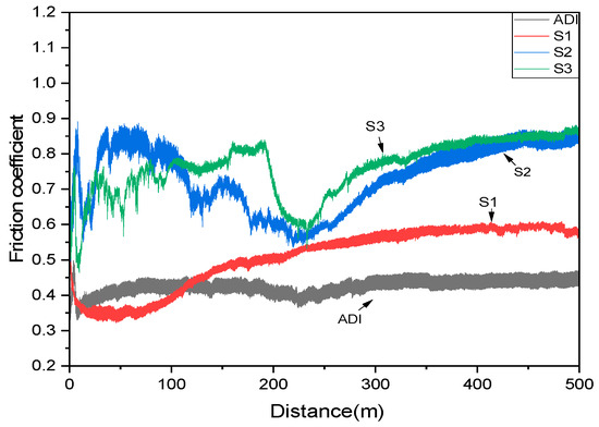 Figure 12 shows that the coated specimens had higher friction coefficients than the uncoated ADI. This is primarily due to the microdroplets formed during the coating process, which increased surface roughness. In contrast, the uncoated ADI contained graphite on its surface to provide a lubricating effect, resulting in the lowest friction coefficient of 0.45. Among the coated specimens, S1 had a slightly higher surface roughness than S2 and S3 but exhibited a lower friction coefficient of approximately 0.55. In comparison, S2 and S3 had similar friction coefficients of around 0.85. It can be inferred that the friction coefficient of the coated specimens is influenced not only by surface morphology but also by the coating structure. As previously mentioned, the S1 structure contained a higher concentration of stabilized CrN and AlN hard ceramic phases, leading to a lower coefficient of friction. In contrast, S2 and S3 exhibited a less stable coating structure, resulting in a higher friction coefficient. These differences in friction behavior are expected to influence the wear performance of the specimens.